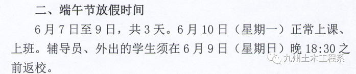 6月7日至9日,共3天。6月10日(星期一)正常上课、上班。辅导员、外出的学生须在6月9日(星期日)晚18:30之前返校。