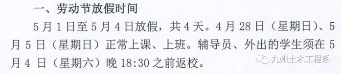 5月1日至5月4日放假,共4天。4月28日(星期日)、5月5日(星期日)正常上课、上班。辅导员、外出的学生须在5月4日(星期六)晚18:30之前返校。