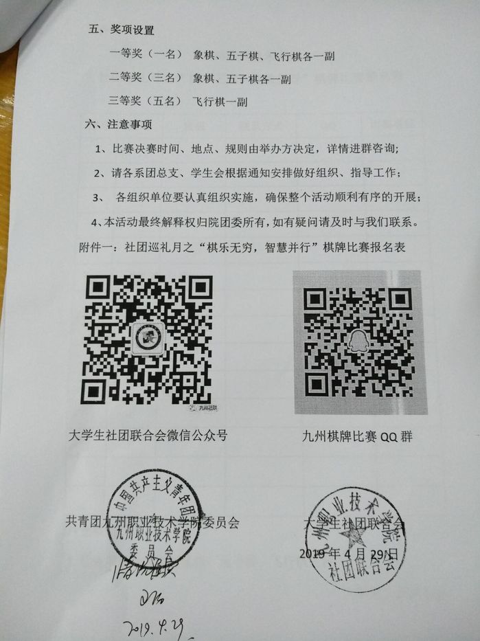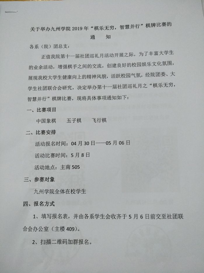 关于举办九州学院2019年“棋乐无穷,智慧并行”棋牌比赛的通知: