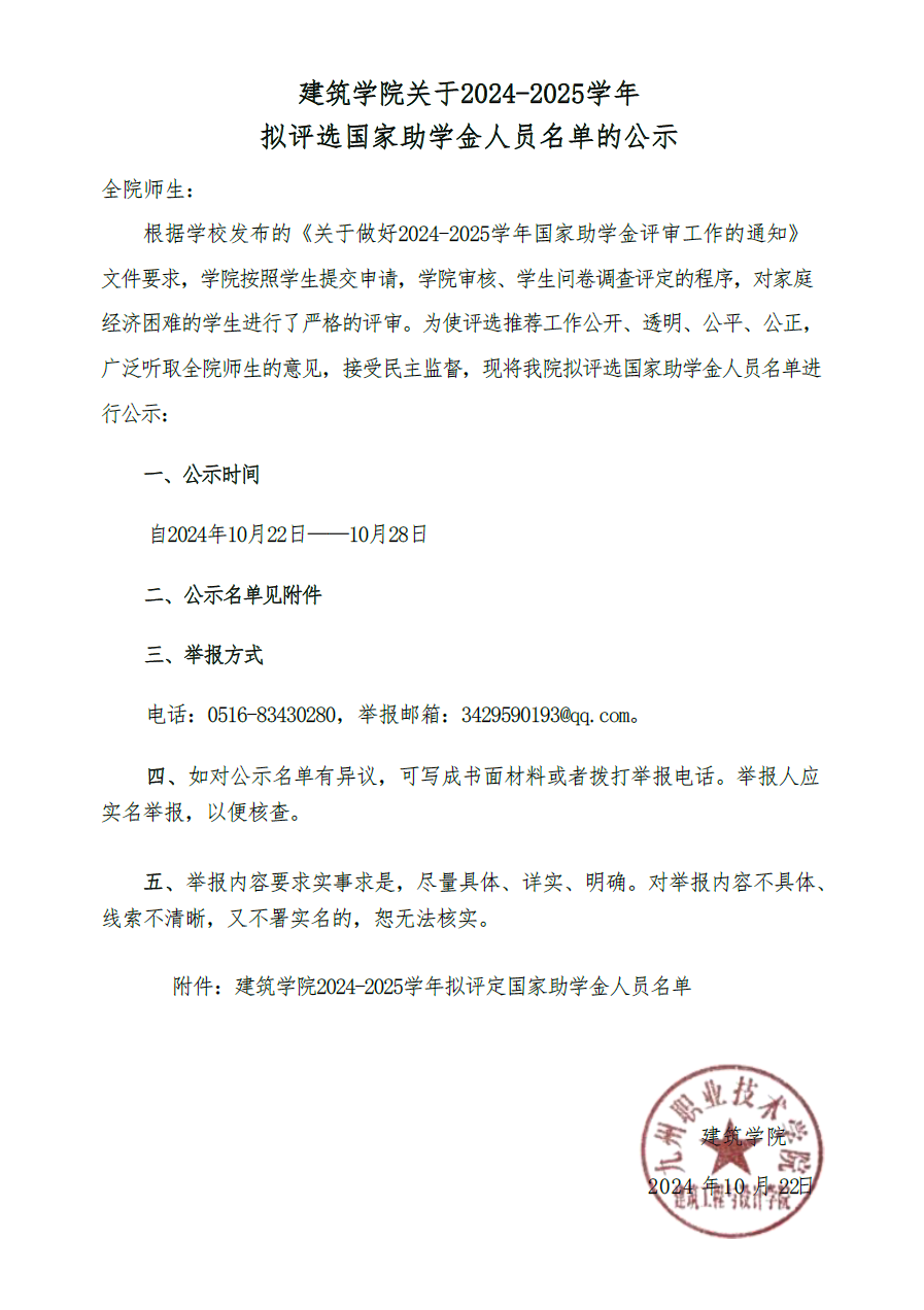 公示:建筑学院关于2024-2025学年 拟评选国家助学金人员名单的公示