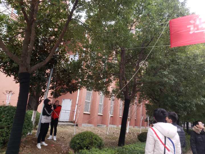 本次活动的主要形式就是悬挂宣传条幅,12月26日中午12:00,社联的干事们下课后就迅速带好条幅和工作证在东门孔子像集合,然后开始准备宣传条幅的悬挂。从学校东门口到学校主楼后,再到女生宿舍前,社联的干事们轻车熟路,很快就将条幅绑好了。
