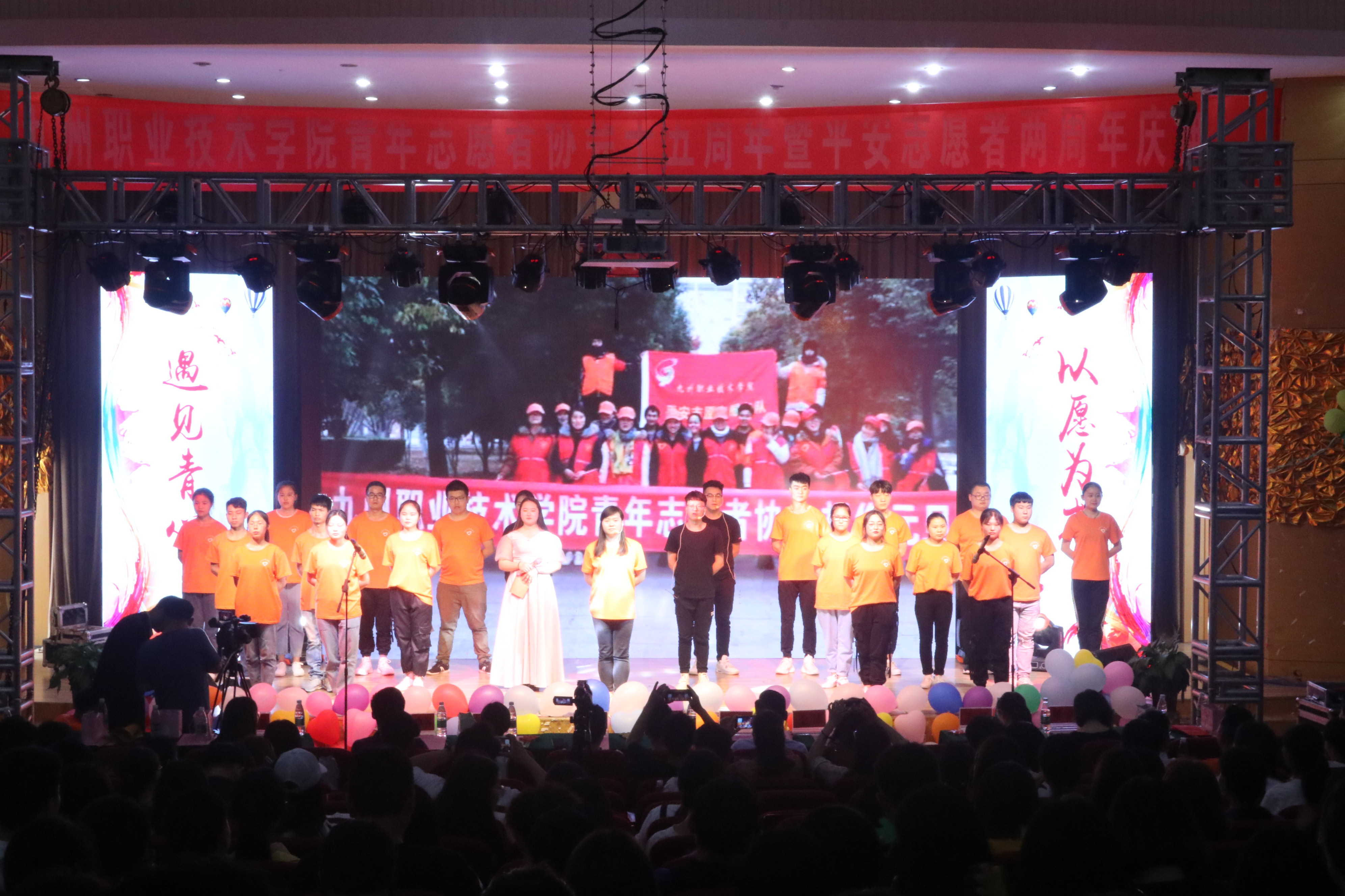 庆典活动,以青年志愿者协会同学们的朗诵、歌伴舞、小合唱、现代舞、汉服舞和手语操等表演为主要形式。朗诵《我是一名平安志愿者》;单曲《春风十里》;小品《爱心天使》、《扶不扶》;歌伴舞与小合唱等表演,从不同角度渲染了我院青年志愿者协会在15年风雨兼程中为社会文明进步作出的贡献,为民众服务奉献的爱心,为徐州市公益活动贡献的青春;表达了当下我院青年志愿者协会立志为社会的和谐、为保一方民众平安、为孤寡老人和弱势群体热情服务的决心,让人们在欢声笑语中感悟青年志愿者的真谛与青春的活力。