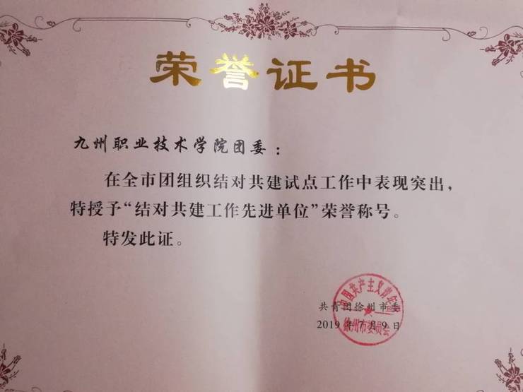 2018年共青团徐州市委开展团组织结对共建试点工作以来,各团组织充分发挥自身优势资源,扎实推进组织联建、资源共享、活动联办、项目联抓,为实现团组织发展做出了积极的探索和实践。涌现出一批先进典型,为表彰先进,激励创先争优,团市委于2019年7月8下发文件《关于表彰全市团组织结对共建试点工作先进单位的通知》(团徐委【2019】52号),并于7月9日召开市团组织结对共建工作现场推进会,会上对前期结对共建试点工作突出的单位进行了表彰,我院团委被授予“徐州市团组织结对共建试点工作先进单位称号”。