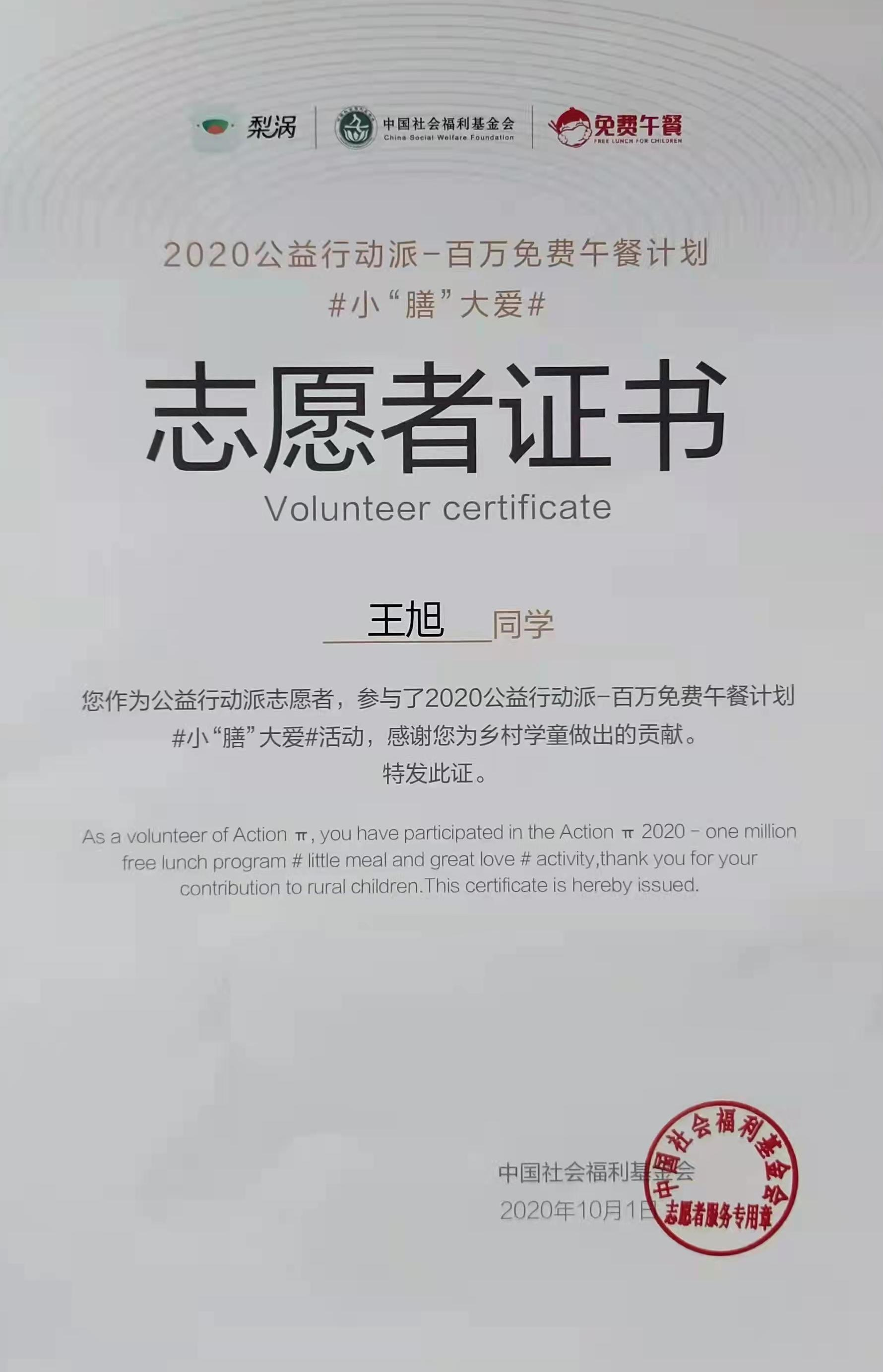 王旭认为作为一名青年大学生,成为一名志愿者,并常常去做志愿服务是一件在正常不过的事,我们生活在如此太平的盛世(先贤们走进历史,为的是让我们更好的拥抱未来),做一些志愿服务,那岂不是在正常不过的事情了吗?在志愿服务的同时又能体悟人间真情,帮助大家,拓宽自己的视野,这难道不是“各美其美,美人之美,美美与共,天下大同”的事吗?他觉得没有理由不去加入志愿者的队伍。
