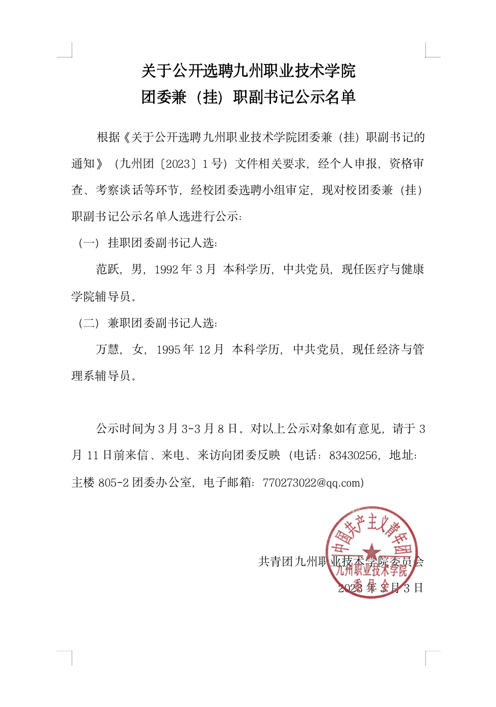 关于公开选聘太阳成集团tyc234cc团委兼(挂)职副书记公示名单