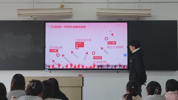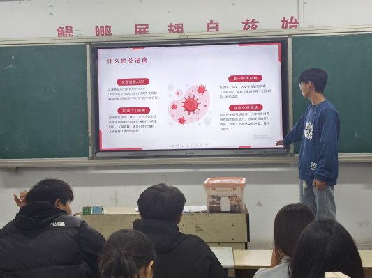 专家讲座后,各二级学院班级同步开展了防艾知识主题班会。在防艾主题班会上,主讲人们依据专家讲座数据内容以及提前准备好的防艾宣传资料,通过防艾知识PPT、防艾主题短视频观赏和防艾知识竞答等方式结合防艾实际事例和直观的影像资料让大家更真切地感受到艾滋病对个人、家庭和社会带来的巨大影响,从而引导同学们展开热烈讨论。