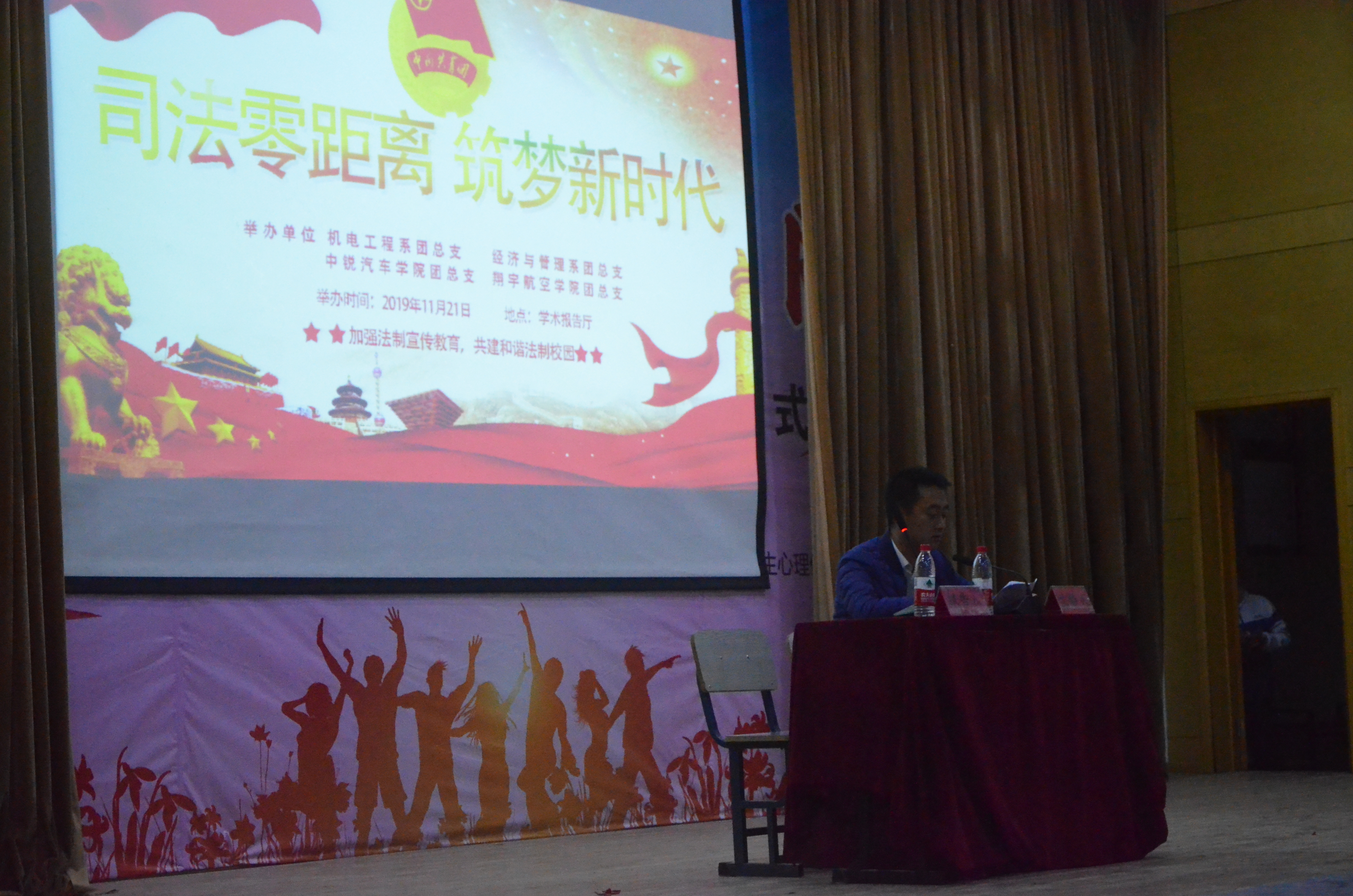 为进一步普及安全防范知识,增强学生的法律法规意识,提高防骗能力,远离不良网络借贷,强化金融安全风险防范和自我保护能力,培养大学生养成学法、知法、懂法、守法的良好习惯,保障学生人身财产安全,维护学校安全与稳定,由机电工程系团总支、经济与管理系团总支、中锐汽车学院团总支、翔宇航空学院团总支开展的主题为“司法零距离,筑梦新时代”的普法宣传月活动进入第二阶段主题报告,于11月25日晚在学院报告厅举行。