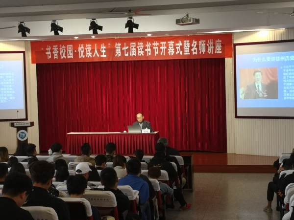 为大学生"多读书、读好书"提供一个学习交流的平台,充实学生的文化底蕴,提升大学生的文化修养和阅读品位,全面提高当代大学生的综合素质。4月23日下午,九州学院"书香校园.悦读人生"第七届读书节开幕式暨名师讲座,应邀学院顾问朱浩熙来作题为“徐州历史文化”的专题报告。学院领导、校团委、图文信息等部门负责人及全校300余名学生聆听了报告。