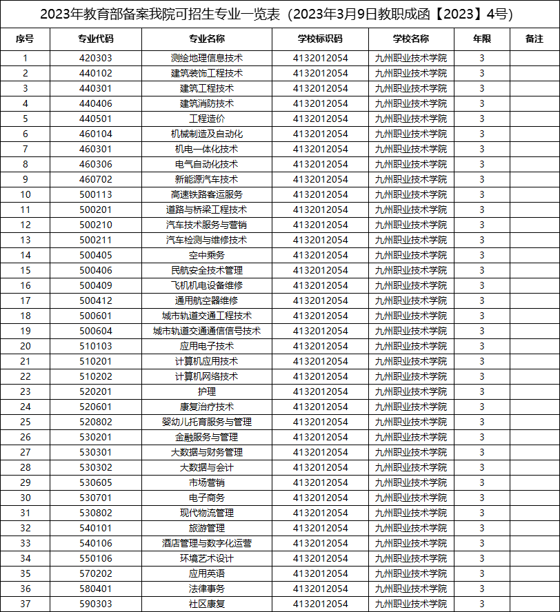 2023年教育部备案我院可招生专业一览表(2023年3月9日教职成函【2023】4号)