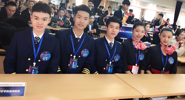 在赛场上,大家熟练地排好队形,翔宇航空学院徐州代表队的学生们以别具一格的礼仪展示向我们展现了女乘务员礼仪动作优美,落落大方。男乘务员朝气蓬勃,阳光帅气。两位女选手拿着行李箱为我们展示的坐姿时,全场掌声不停,评委们也频频称赞。