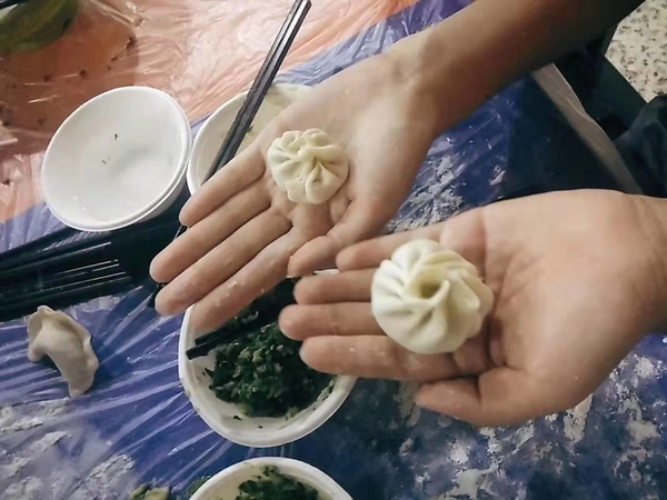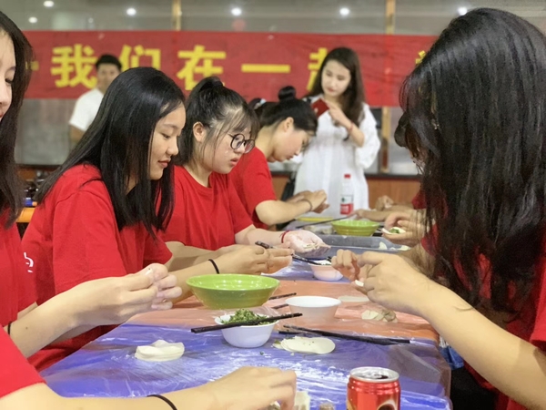 在史老师一声令下,每个班选出的10个人开始大展身手,女生们心灵手巧,包出的饺子精美别致;男生们不甘落后,不满足于传统饺子的形状,他们试着玩起