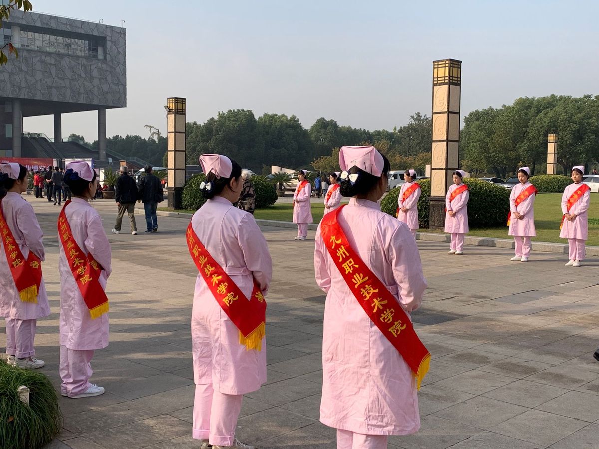 十一月一日早上七点半准时出发前往老年产业博览会。在老博会上,医疗与健康学院的同学们是一道靓丽的粉色风景线,穿着护士服的她们精神抖擞、脸上洋溢着微笑,不慌不乱的维持着场上的秩序,尽显志愿者风范。