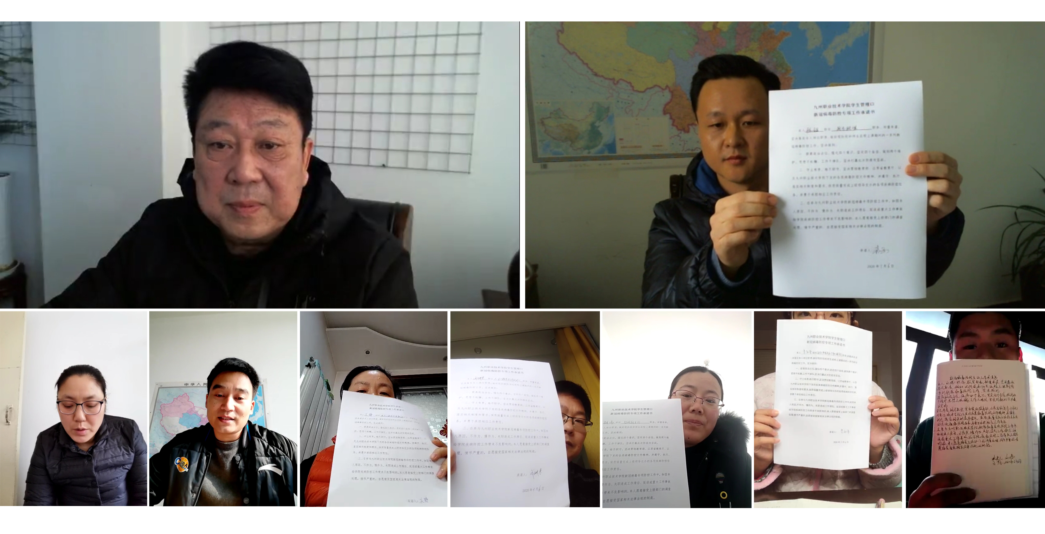 为统一思想,强化在新冠肺炎疫情期间的责任意识,落实相关举措安排,3月6日上午9:30,我院学工系统利用“腾讯会议”软件召开疫情防控专题网络视频会议。会议由学工处处长武艳主持,董事长曹竟成、院长助理张超、学院办公室副主任李德才、学工处全体工作人员以及各系(院)行政副主任和全院专兼职辅导员参加会议。