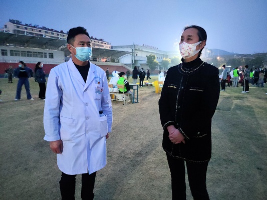 疫情防控工作人员、党员志愿者、学生志愿者在现场各司其职,保证受检人员的队伍整齐有序。