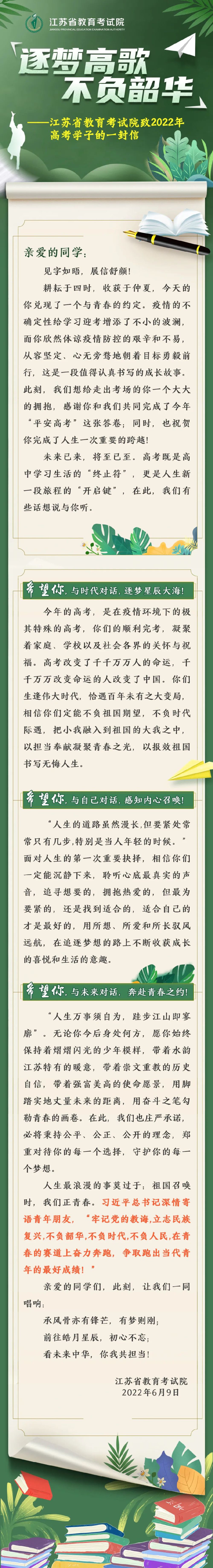 逐梦高歌 不负韶华——江苏省教育考试院致2022年高考学子的一封信