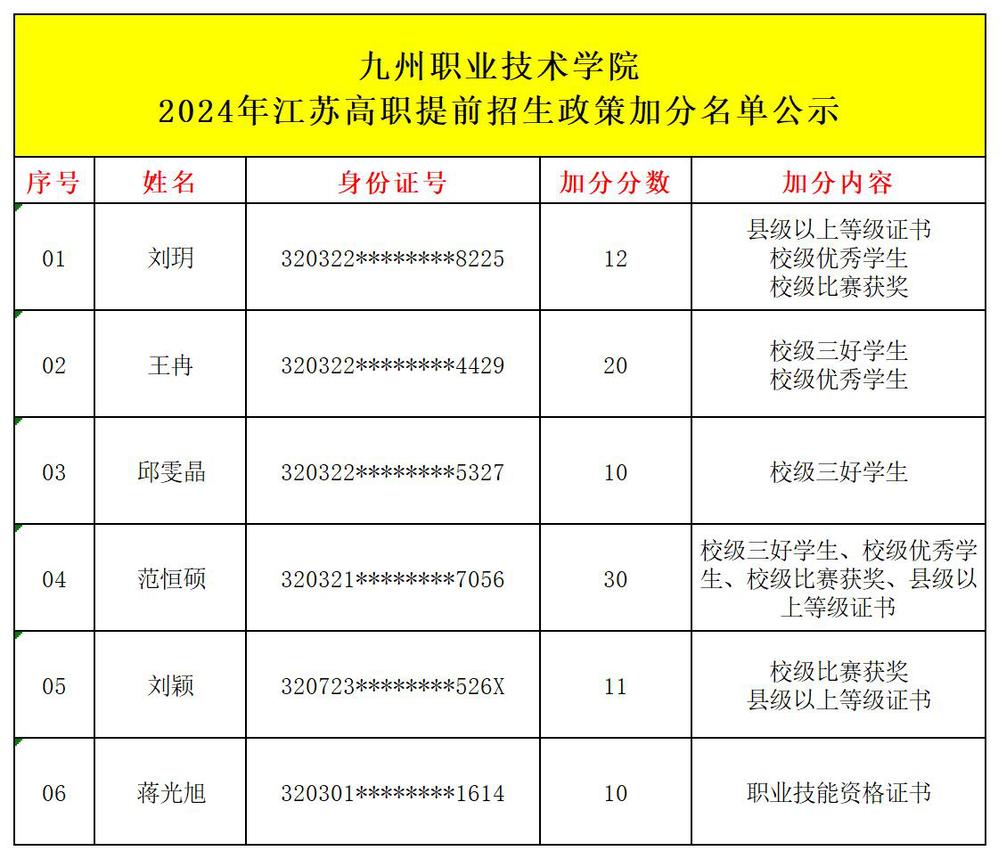 根据《太阳成集团tyc234cc2024年高职院校提前招生章程》政策加分的相关规定,经考生提交申请材料,我校统一审核后,现将太阳成集团tyc234cc2024年江苏高职提前招生第一轮符合政策加分的名单予以公示。(名单详见下图)